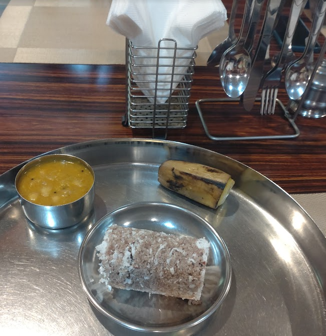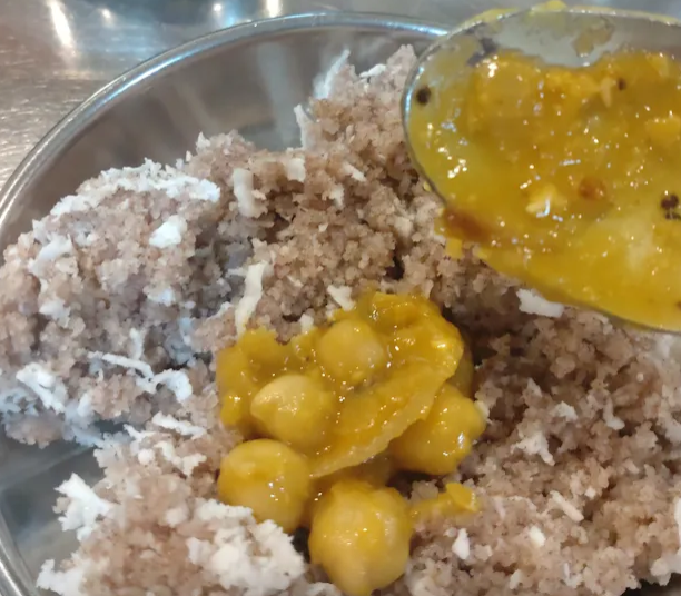 もう一つ印象的だったのが、プットゥです。米粉とすりおろしたココナッツを層状に重ねて蒸した料理で、円筒形の専用の蒸し器で作られます。切り口が美しい年輪のようになっていて、見た目にも楽しい一品。