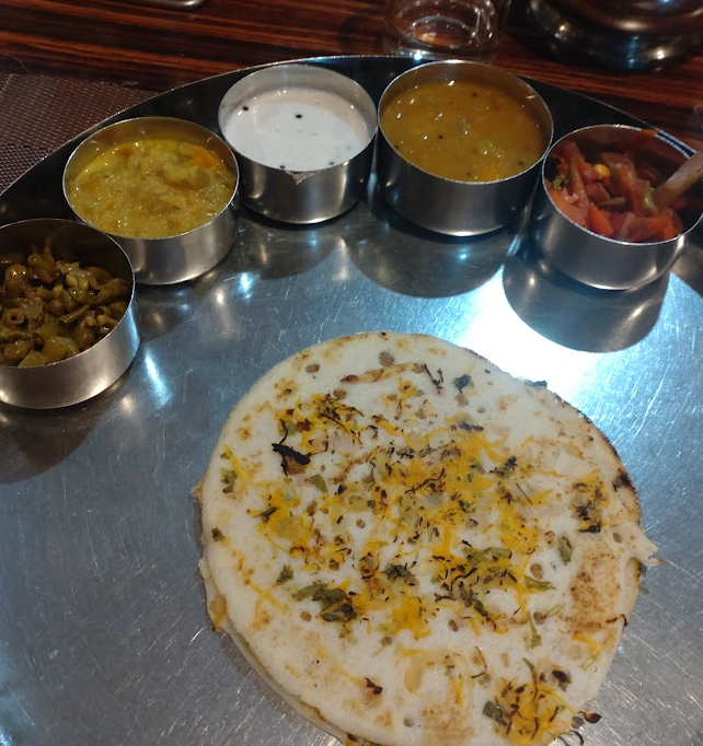 トマト、玉ねぎ、青唐辛子などの具材を生地に混ぜ込んで焼き上げるので、野菜の甘みとスパイスの香りが一体となった味わい。サンバルやチャツネと一緒に食べると、朝から元気が湧いてきます。